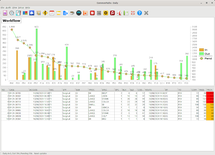 The bar and line chart at the top shows today's distribution of cases among all the pathologists by Code5. The units of both Y-axis' are minutes, where a full-day workload is equil to 360 minutes. The left-side Y-axis shows the new cases routed today in the amber bar (in), and the finalized cases are in the green bar (out). The right-side Y-axis shows the backlog (line with red circles) also in number of minutes required to complete the cases. The pathologists are sorted by their backlog volume.