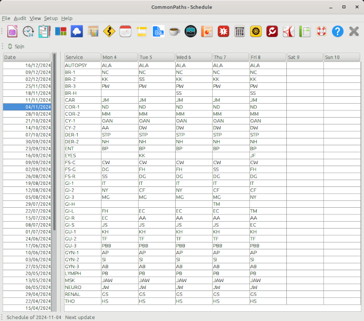 This report shows the living and optimized pathologists schedule on a weekly basis. It can be viewed by service or by pathologist. It displays 5 weeks in the future and 47 weeks in the past. You can also get a summary of the schedule distribution over a year, or parts of a year in the Workdays report.