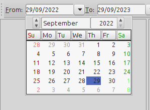 Warning: When editing a date with the widget, you must always end the selection by pressing the day of month, even if the display is correct. This will trigger an event that the date has been selected, otherwise, the changes will not take effect. Therefore, always change the year first, then the month, then the day. You can view the selected dates as interpreted by the application at the bottom statusbar.
