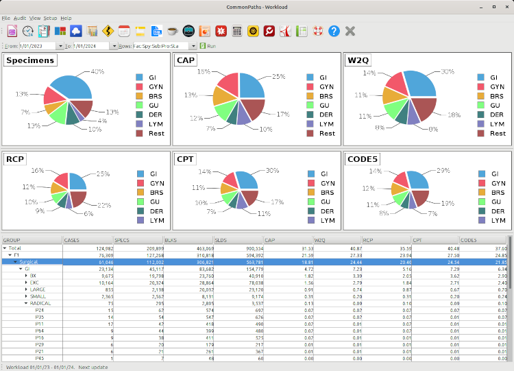 The workload report shows the various metrics that measure pathologists workload, including the total number of cases, specimens, blocks, slides, as well as the FTE for CAP-L4E, W2Q, RCP-UK, CPT-USA and Code5. You can define what cases to be included in this report using the templates in the setup menu. The data is displayed in pie charts and a treetable. A treetable shows totals on the top (root), followed by a breakdown hierarchy in the rows (branches), each containing the individual items (leaves). To learn how to use a treetable, please refer to this tutorial page.